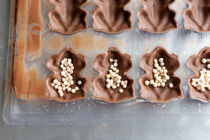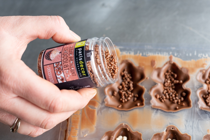 Il est temps maintenant de remplir vos chocolat. Pour l'effet de surprise j'ai choisi d'ajouter du sucre pétillant. Versez plus ou moins de grains dans la coque, vous pouvez mettre du blé soufflé également.