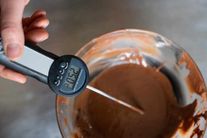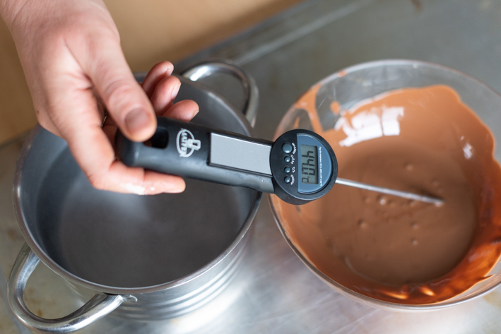 Nous allons dans un premier temps tempérer notre chocolat pour qu'il soit super brillant. Je me faisais tout un monde du tempérage mais finalement c'est vraiment simple. Il faut chauffer le chocolat, le remuer régulièrement jusqu'à ce qu'il atteigne 45°. Ensuite, laissez-le refroidir jusqu'à ce qu'il soit à 25° puis le faire chauffer jusqu'à 30° avant de le couler dans le moule.