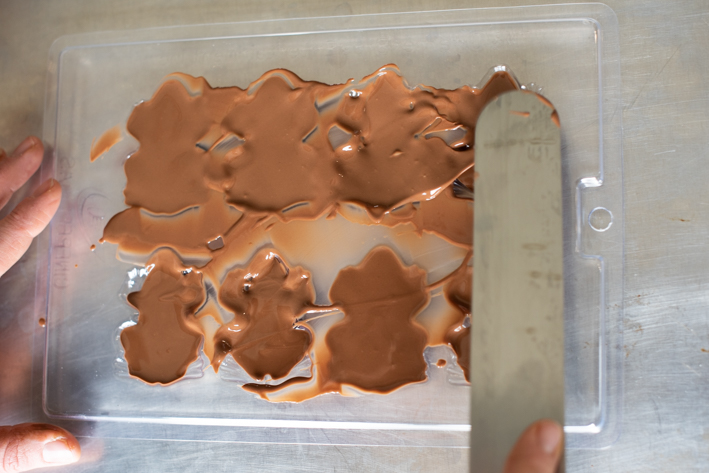 Une fois la coque durcit, retirer le chocolat restant et qui dépasse de la coque en raclant le moule avec votre spatule.