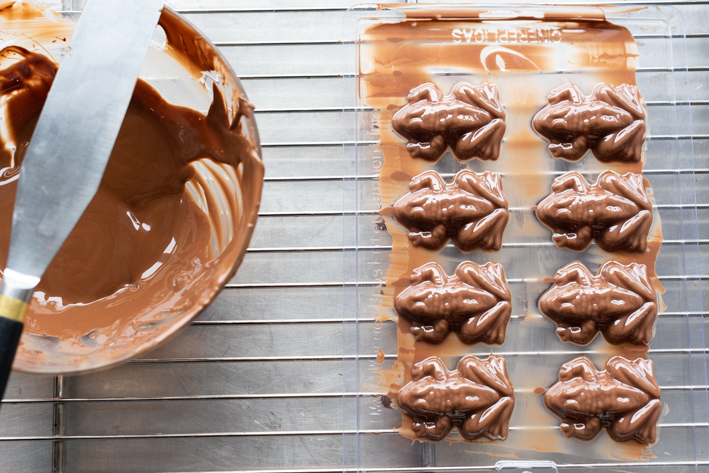 Faire fondre le chocolat de couverture comme expliqué au tout début de cet article et finir de remplir les moules. Étalez bien cette dernière couche de chocolat avec la spatule. Durant cette étape i l est important de retirer l’excédent de chocolat tout autour des grenouilles. En effet s'il reste du chocolat celui-ci va rester attacher aux contours de votre grenouille et ce ne sera pas parfait.
