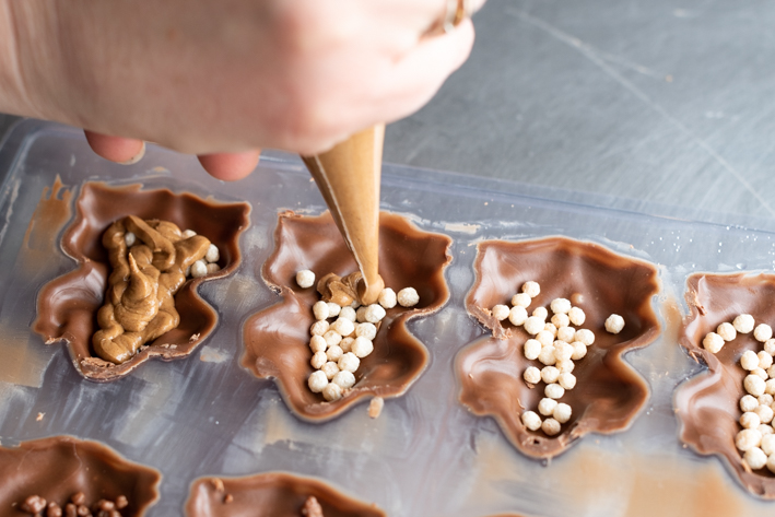 Ensuite mettez un peu de guanduja ou de pralin dans une poche à douille et remplir les coques. Étalez à la spatule. N'en mettez pas trop il faudra ensuite "fermer" les coques avec un peu de chocolat de couverture fondu.